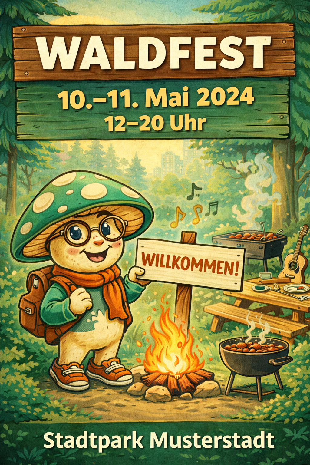 Wir treffen uns im Stadtpark Musterstadt zu einem entspannten Waldnachmittag mit Musik, Picknick und gemeinschaftlichem Grillen. Bring gerne eine Decke, etwas zum Teilen (Snack/Salat) und gute Laune mit. Vor Ort gibt es eine kleine Feuerstelle (nur wenn erlau…